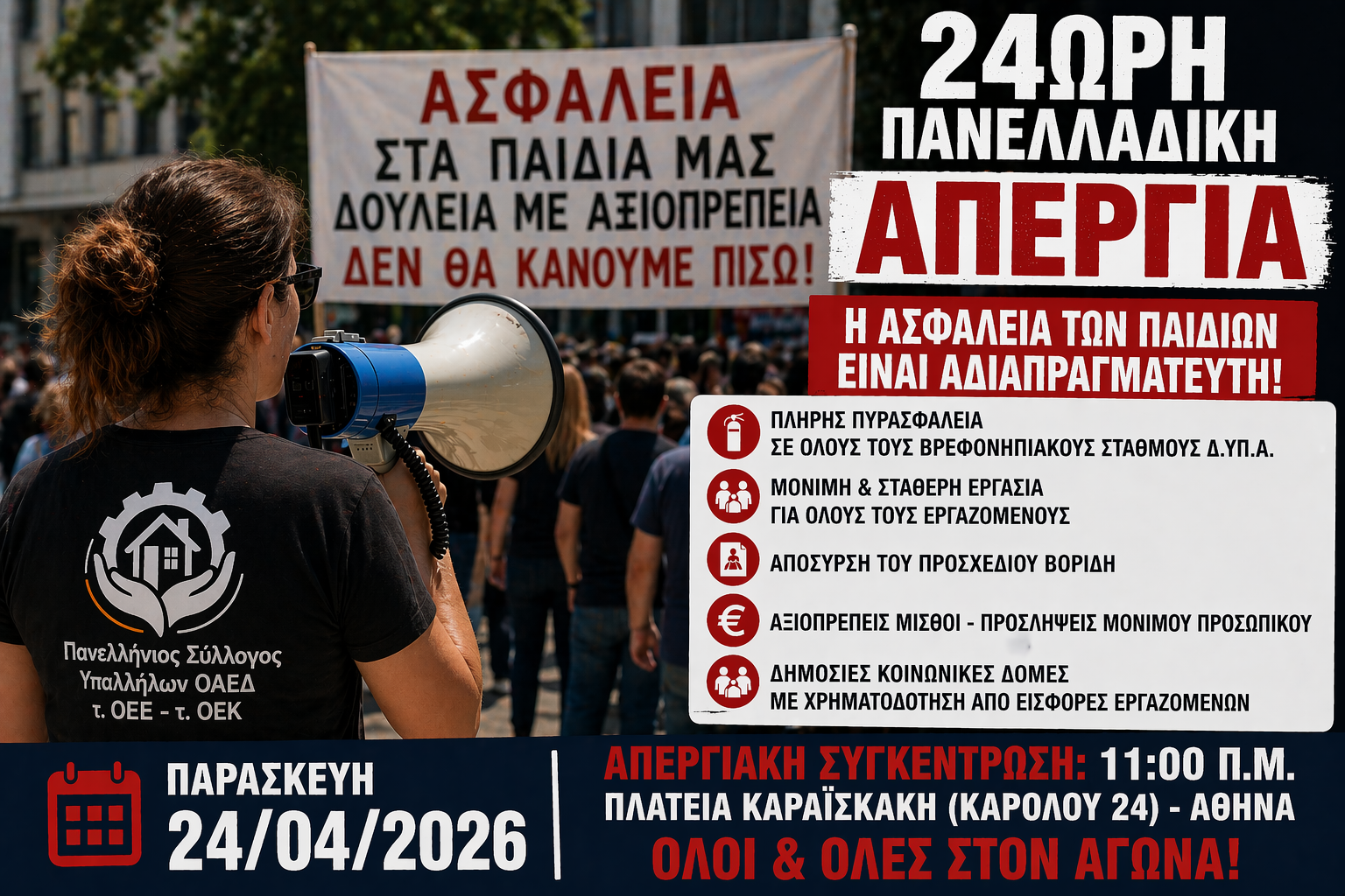 24ΩΡΗ ΠΑΝΕΛΛΑΔΙΚΗ ΑΠΕΡΓΙΑ ΓΙΑ ΤΟΥΣ ΒΡΕΦΟΝΗΠΙΑΚΟΥΣ ΣΤΑΘΜΟΥΣ Δ.ΥΠ.Α. ΠΑΡΑΣΚΕΥΗ 24 ΑΠΡΙΛΙΟΥ 2026 ΑΠΕΡΓΙΑΚΗ ΣΥΓΚΕΝΤΡΩΣΗ 11.00 Π.Μ. – ΠΛΑΤΕΙΑ ΚΑΡΑΪΣΚΑΚΗ |