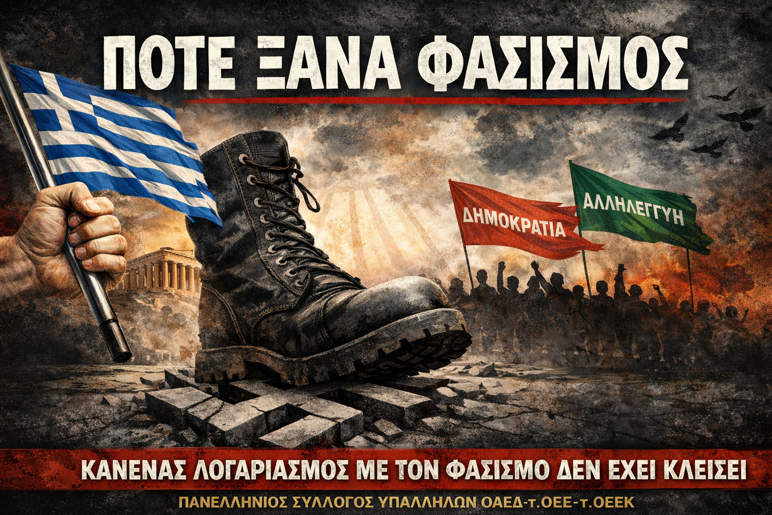 Ως ΠΑΝΣΥΠΟ, σωματείο εργαζομένων στη Δημόσια Υπηρεσία Απασχόλησης (ΔΥΠΑ), γνωρίζουμε ότι ο φασισμός δεν γεννήθηκε στο κενό, χωρίς βάσιμους λόγους και αιτίες. Τον εξέθρεψαν η ανεργία και η φτώχεια, η διάλυση των εργασιακών δικαιωμάτων, η αποδιάρθρωση του κοινωνικού κράτους, η απαξίωση των δημόσιων υπηρεσιών, η ρατσιστική ρητορική και ο κοινωνικός αυτοματισμός που στοχοποιεί τους πιο αδύναμους. Πάνω σε αυτό το έδαφος πάτησε η Χρυσή Αυγή για να στήσει τάγματα εφόδου, πογκρόμ στις λαϊκές γειτονιές και στους χώρους δουλειάς, επιθέσεις σε μετανάστες, συνδικαλιστές και αγωνιστές.