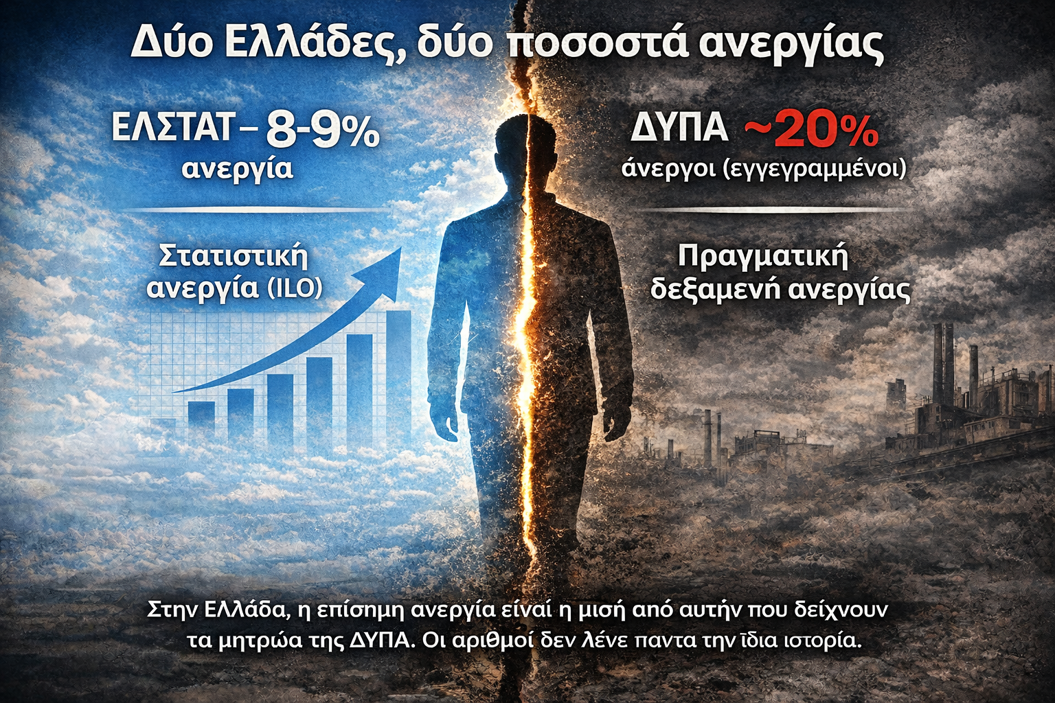 Η ΕΛΣΤΑΤ εμφανίζει την ανεργία γύρω στο 9–9,8% το 2024, με περίπου 430–450 χιλιάδες ανέργους, ενώ τα επίσημα στατιστικά της Δ.ΥΠ.Α δείχνουν 977.687 εγγεγραμμένους ανέργους τον Δεκέμβριο 2024 και 915.889 τον Δεκέμβριο 2025, εκ των οποίων σχεδόν οι μισοί είναι μακροχρόνια άνεργοι (πάνω από 12 μήνες). Μόνο για τον Νοέμβριο 2025 η ΕΛΣΤΑΤ ανακοίνωσε περίπου 395 χιλιάδες ανέργους (8,2%), ενώ η Δ.ΥΠ.Α 894.065 εγγεγραμμένους – μισό εκατομμύριο ανθρώπους διαφορά και χάσμα πάνω από 10 ποσοστιαίες μονάδες στο πραγματικό ποσοστό ανεργίας.
