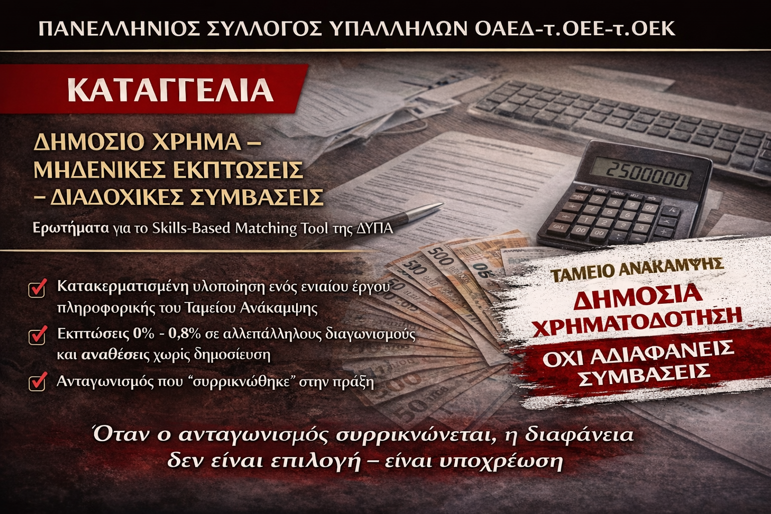 Η υπόθεση του Skills-Based Matching Tool αφορά τη διαχείριση δημόσιων και ευρωπαϊκών πόρων σε μια περίοδο όπου η ελληνική κοινωνία παρακολουθεί με αυξανόμενο σκεπτικισμό τον τρόπο αξιοποίησης του Ταμείου Ανάκαμψης. Οι πόροι αυτοί συνοδεύονται από αυξημένες υποχρεώσεις διαφάνειας, λογοδοσίας και θεσμικής συνέπειας.