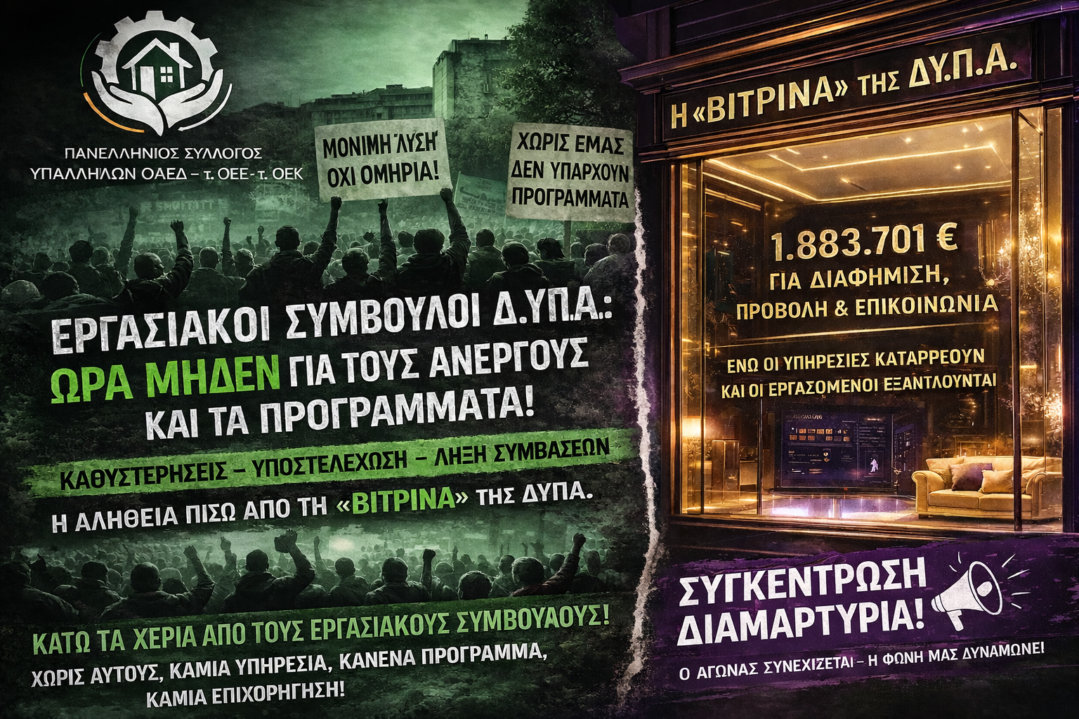 Ο αγώνας των συμβασιούχων Εργασιακών Συμβούλων είναι αγώνας για να έχουν οι άνεργοι πραγματικές υπηρεσίες, για να στηρίζονται στην πράξη οι μικρές και μεσαίες επιχειρήσεις, για να υπάρχει Δημόσια Υπηρεσία Απασχόλησης με προσωπικό, δικαιώματα και αξιοπρέπεια.