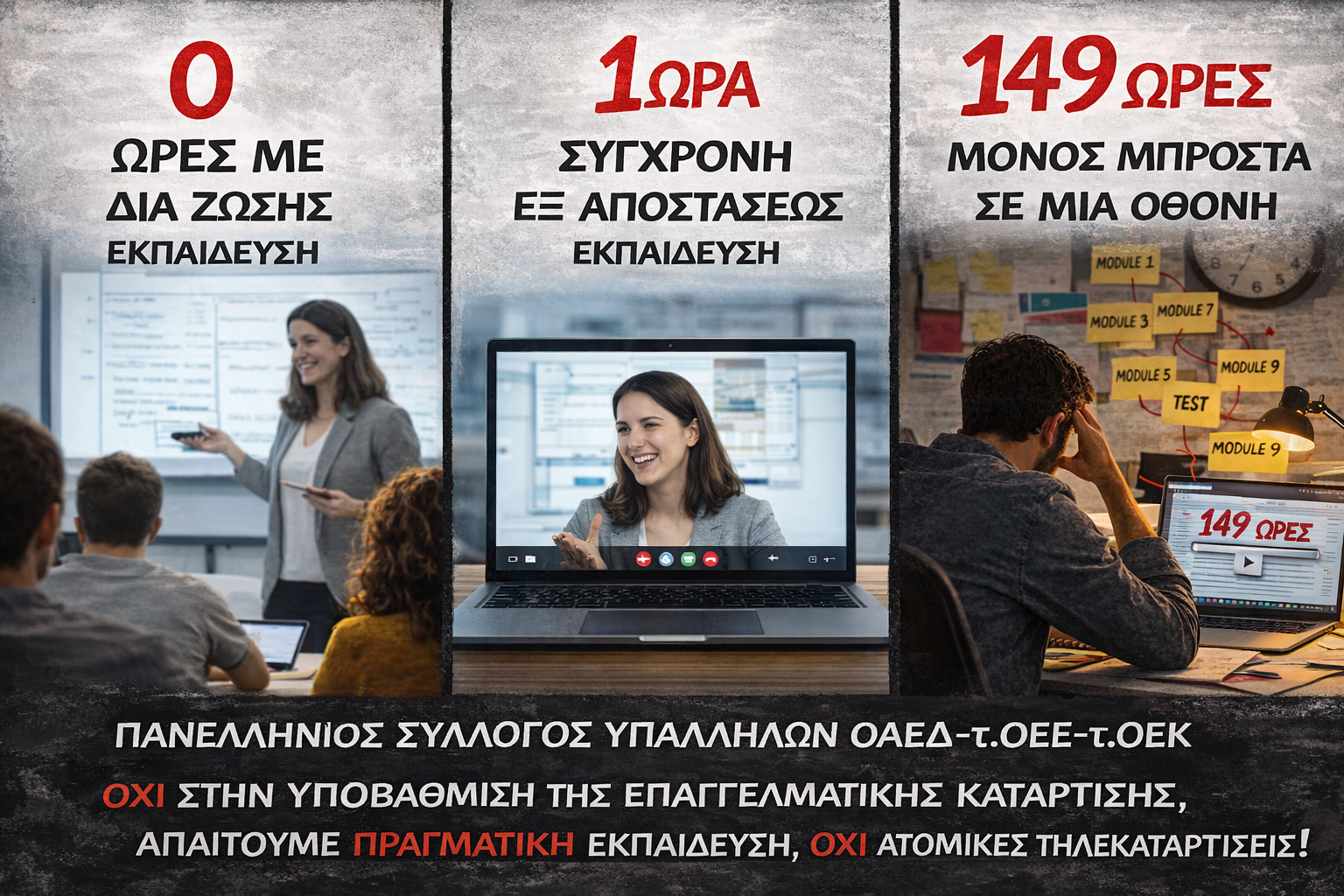 Έτσι, πίσω από τον τίτλο της «αναβάθμισης δεξιοτήτων», διαμορφώνεται ένα σχήμα όπου η ζωντανή εκπαιδευτική σχέση (η πραγματική σύγχρονη διδασκαλία) περιορίζεται σε αναλογία 1 προς 149, και ο εργαζόμενος μετατρέπεται σε ατομικό χρήστη ηλεκτρονικής πλατφόρμας, που οφείλει να «τρέξει» μόνος του 149 ώρες ασύγχρονης κατάρτισης για να μη χάσει το εκπαιδευτικό επίδομα και την πιστοποίηση.