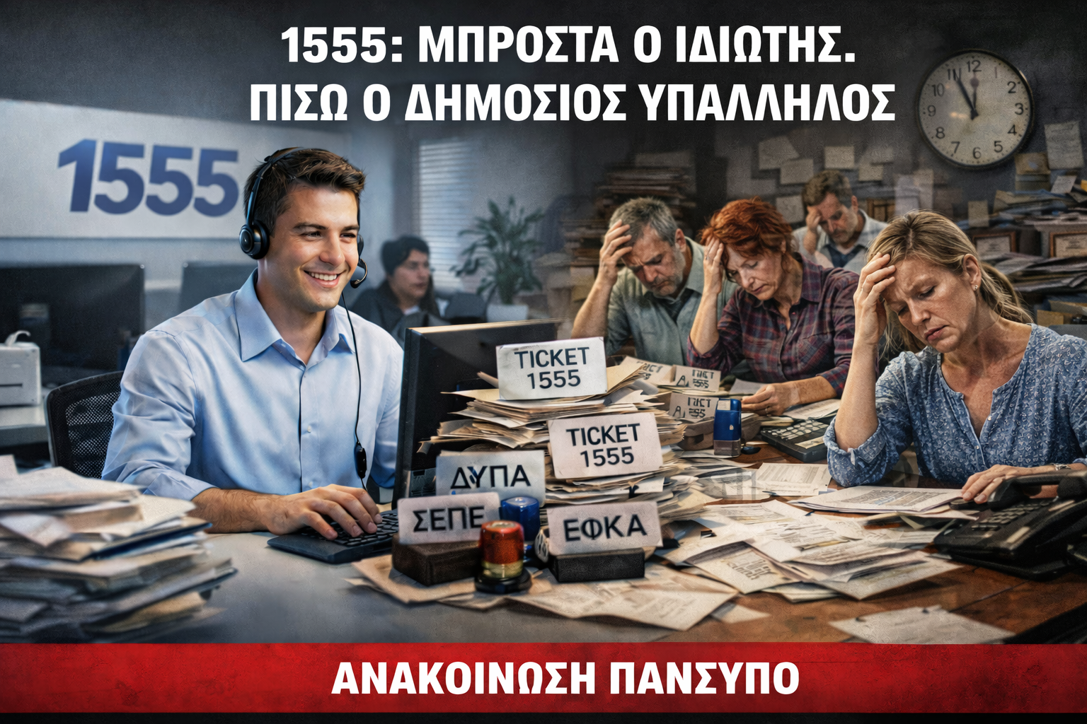 Το 1555 πλασαρίστηκε ως «ενιαίος» μηχανισμός εξυπηρέτησης για εργασιακά/ασφαλιστικά/κοινωνικά ζητήματα, με επίκληση όγκων κλήσεων και χρόνων αναμονής, όμως η πραγματική εικόνα αποκαλύπτεται σήμερα από τα ίδια τα επίσημα έγγραφα: η Πολιτεία άφησε τη σύμβαση να λήξει, δεν ωρίμασε εγκαίρως τον νέο διαγωνισμό και κατέληξε σε λύση «κατεπείγοντος» χωρίς δημοσίευση.
