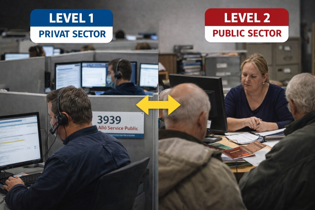Στη Γαλλία υπάρχει ένα χαρακτηριστικό μοντέλο «2 επιπέδων» στο τηλεφωνικό 3939 (Allô Service Public): το επίπεδο 1σηκώνει τις κλήσεις και απαντά τις «βασικές/επαναλαμβανόμενες» ερωτήσεις με τυποποιημένες πληροφορίες και, σύμφωνα με κρατική έκθεση, αυτό το πρώτο επίπεδο έχει ανατεθεί σε ιδιώτη πάροχο. Όταν όμως η ερώτηση απαιτεί υψηλότερη εξειδίκευση, το αίτημα περνά στο επίπεδο 2, που το χειρίζεται δια-υπουργική δημόσια δομή/δημόσιοι υπάλληλοι (όπως αναφέρει η ίδια έκθεση για το “niveau 2” του 3939). Παράλληλα, επισημαίνεται και από διοικητικές σελίδες της Γαλλίας ότι το 3939 είναι υπηρεσία γενικής πληροφόρησης (δεν έχει πρόσβαση σε προσωπικούς φακέλους), άρα για «ειδικά»/προσωποποιημένα ζητήματα ο πολίτης πρέπει να απευθυνθεί στον αρμόδιο φορέα.